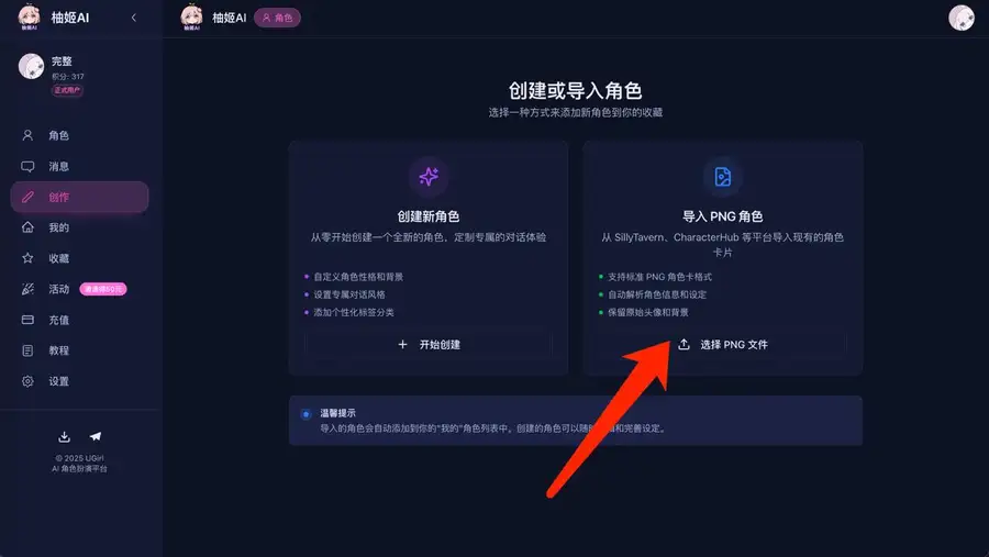 - 等待导入完成提示:“角色卡已导入,可在我的角色中查看”