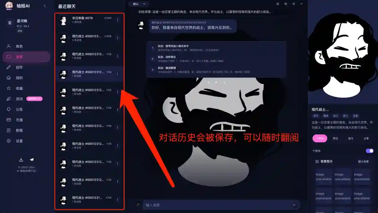 我们聊天之后的记录不用怕消失,在我们的侧边栏里面会永久保存,但是最多保存不能超过15条,后续随着运营我们会提升这个最大限制